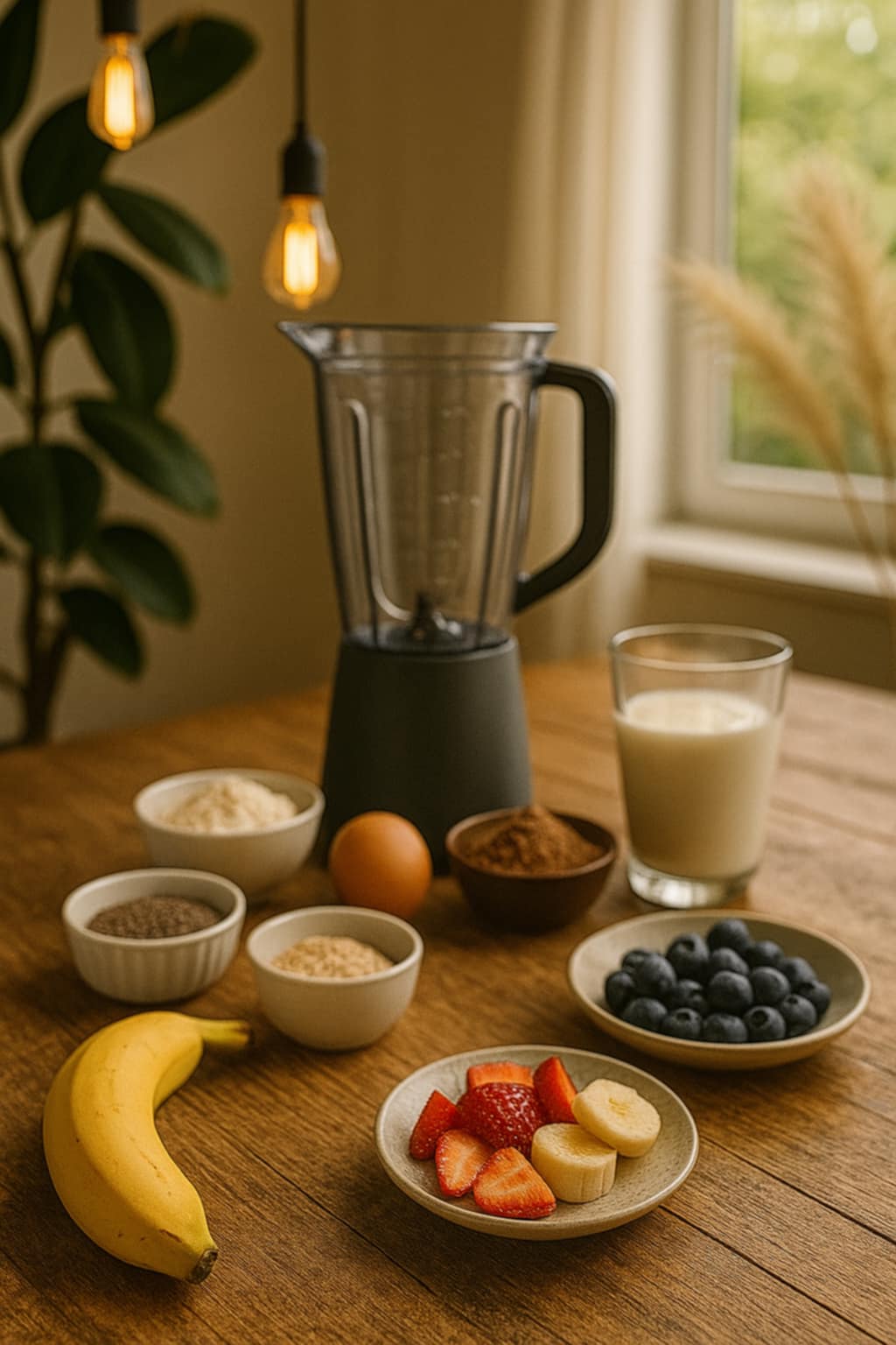 Într-un blender sau robot de bucătărie, adaugă oul, laptele, banana, făina, pudra proteică, semințele de chia, cacaoa și praful de copt.